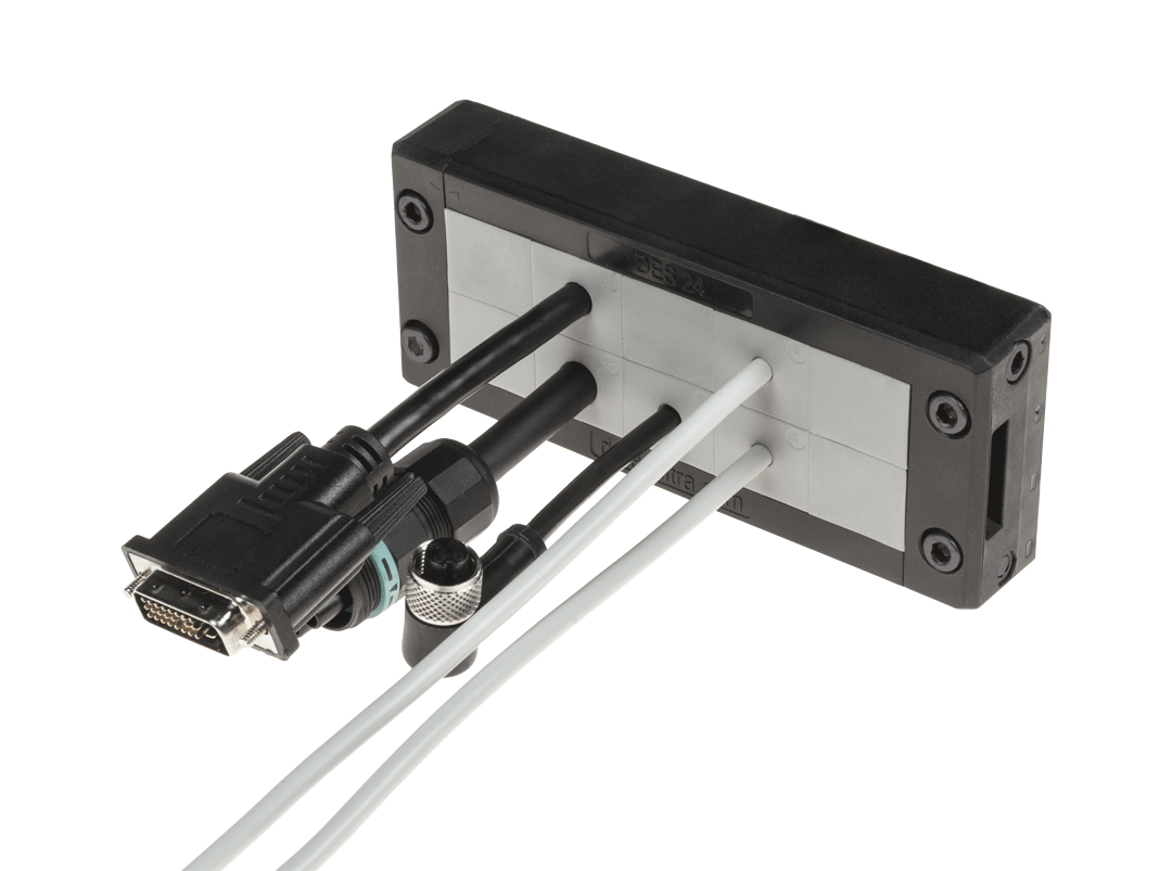 De DES 24 is een krachtig en flexibel deelbaar kabeldoorvoersysteem, ontworpen voor het doorvoeren van kabels met of zonder connector met diameters van 2 tot 35 mm. Dankzij de ruime afmetingen en compatibiliteit met diverse grommettypes is dit systeem ideaal voor toepassingen met veel of dikke kabels, zoals in industriële automatisering, schakelkasten en machinebouw.